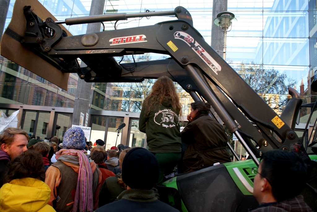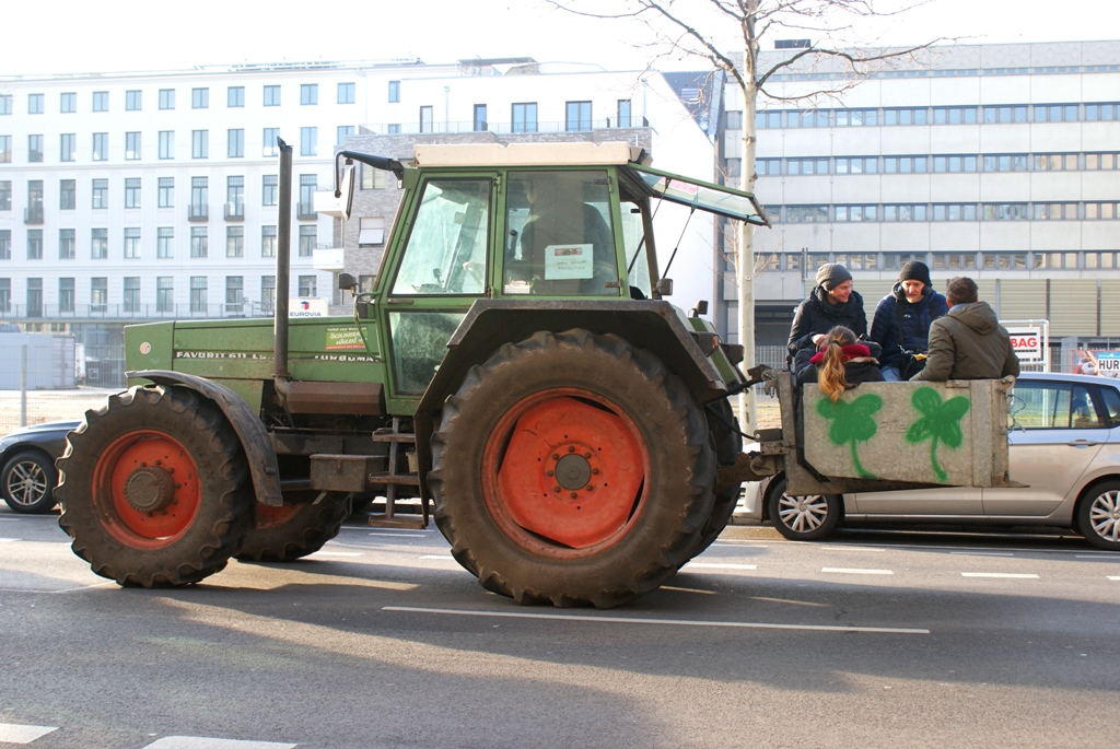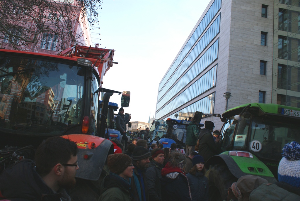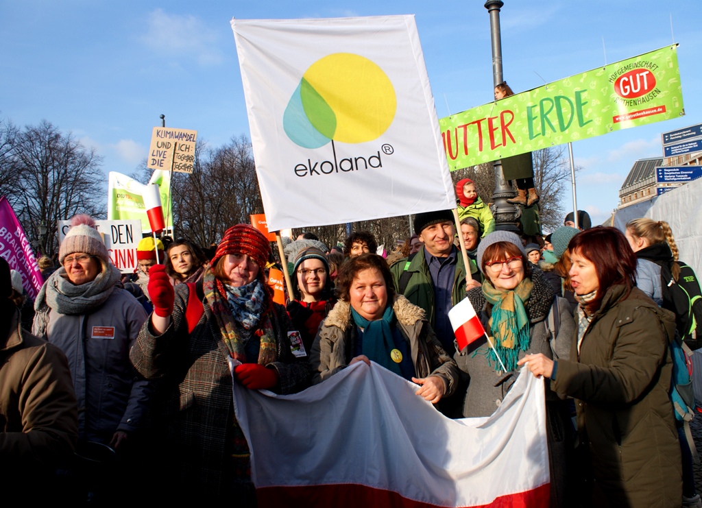 Punktem kulminacyjnym naszej wizyty był niewątpliwie udział w sobotniej wielkiej demonstracji „Wir haben Agrarindustrie satt!” czyli „Mamy dość rolnictwa przemysłowego!”. Idąc pieszo z hotelu, na jednej z ulic natknęliśmy się na sznur przejeżdżających wolno traktorów. Zrobiło to na nas ogromne wrażenie; nie mogliśmy dostrzec ani początku, ani końca tej traktorowej kawalkady. Jak się później dowiedzieliśmy, po ulicach miasta jeździło 170 maszyn, które przyjechały z różnych, nawet bardzo odległych części Niemiec. Wszystkie pojazdy ozdobione były transparentami z hasłami wzywającymi do ochrony klimatu i środowiska oraz apelami o rolnictwo produkujące pełnowartościową żywność, dbające o dobrostan zwierząt i sprawiedliwość społeczną. Ludzie wiwatowali i z entuzjazmem pozdrawiali rolników. To były naprawdę wzruszające chwile, kiedy poczuliśmy się częścią wspólnoty, działającej na rzecz lepszej przyszłości dla rolników/rolniczek i konsumentek/konsumentów. Następnie demonstrujący tłum zgromadził się przed sceną koło Bramy Brandenburskiej, z której przemawiali aktywiści i aktywistki zielonego ruchu.